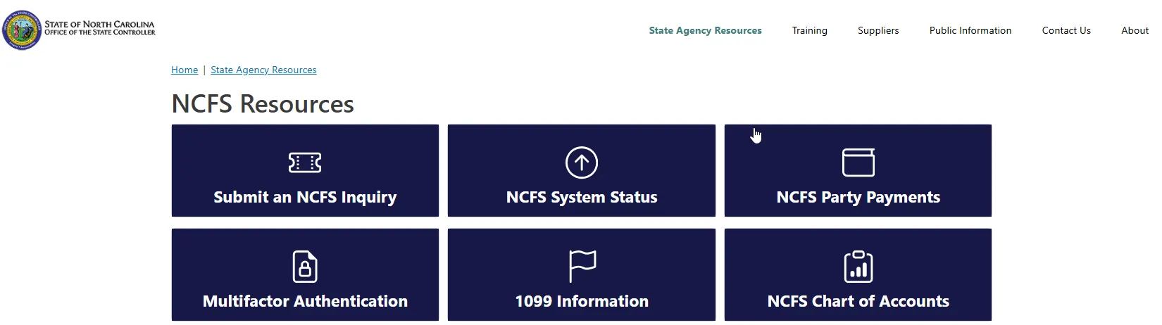 Step 1. From the NCFS Resources web page on the OSC website, scroll down to find the Pre-Built Reports tile. The URL is: https://ncosc.gov/state-agency-resources/ncfs-resources.