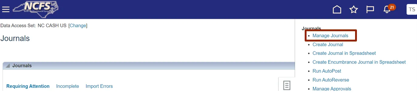 Step 5. Under Journals, click Manage Journals.