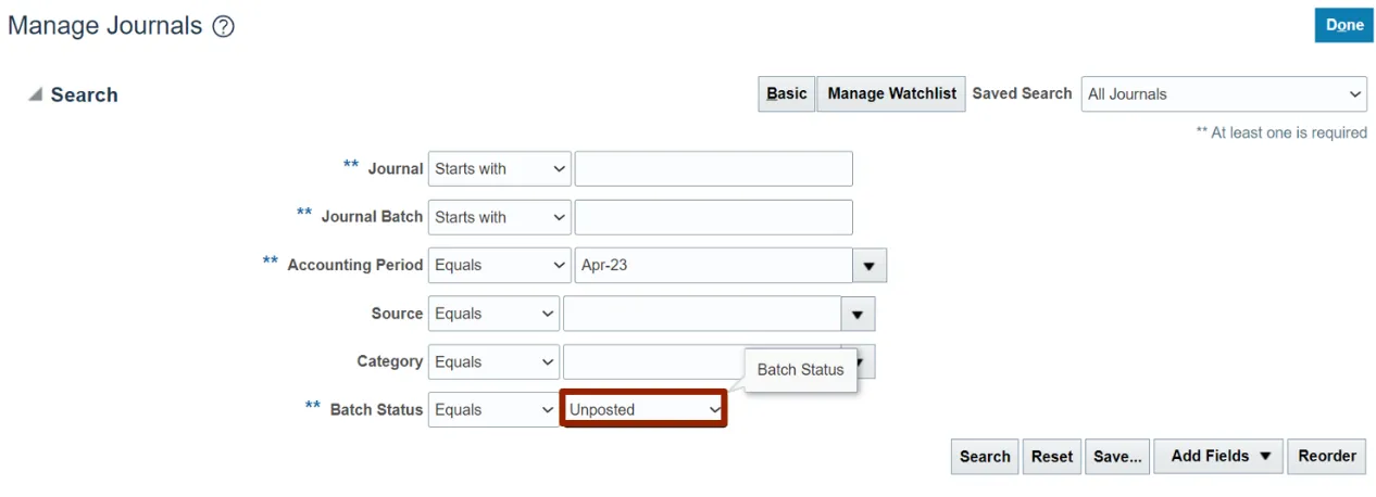 In this example, we choose: Equals Unposted for the **Batch Status.