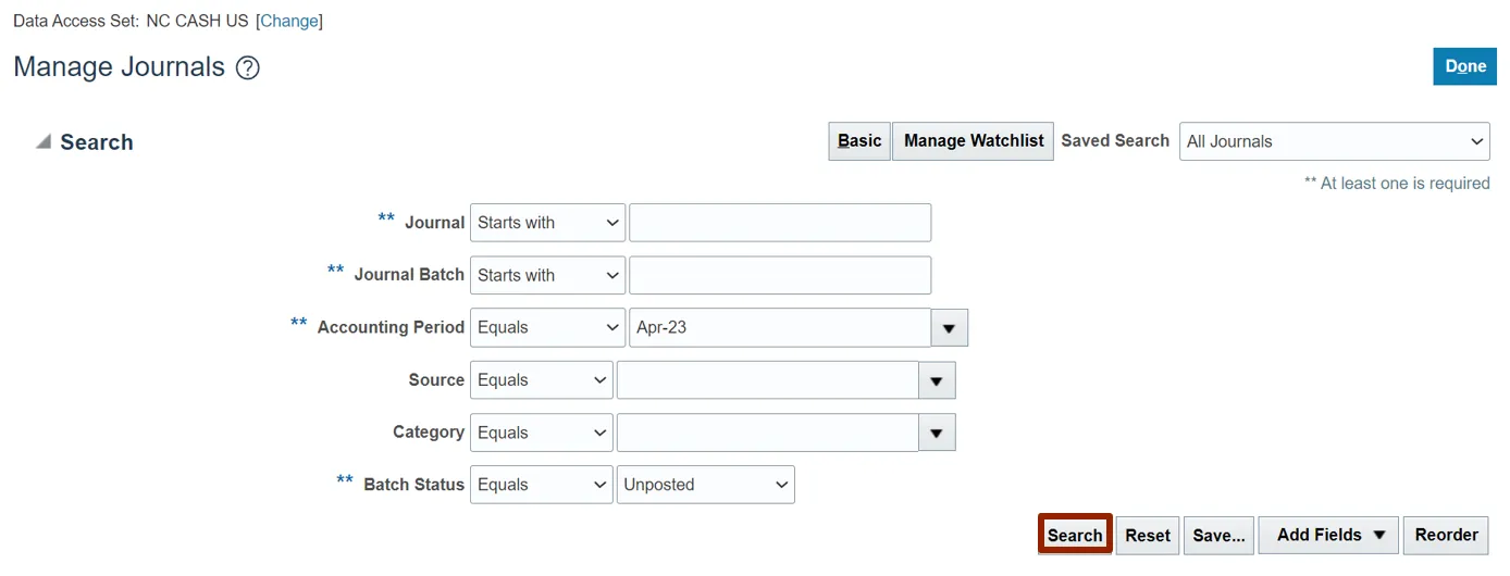 Step 6. The Manage Journals page displays. Under the Search section, input criteria for at least one field marked with **.