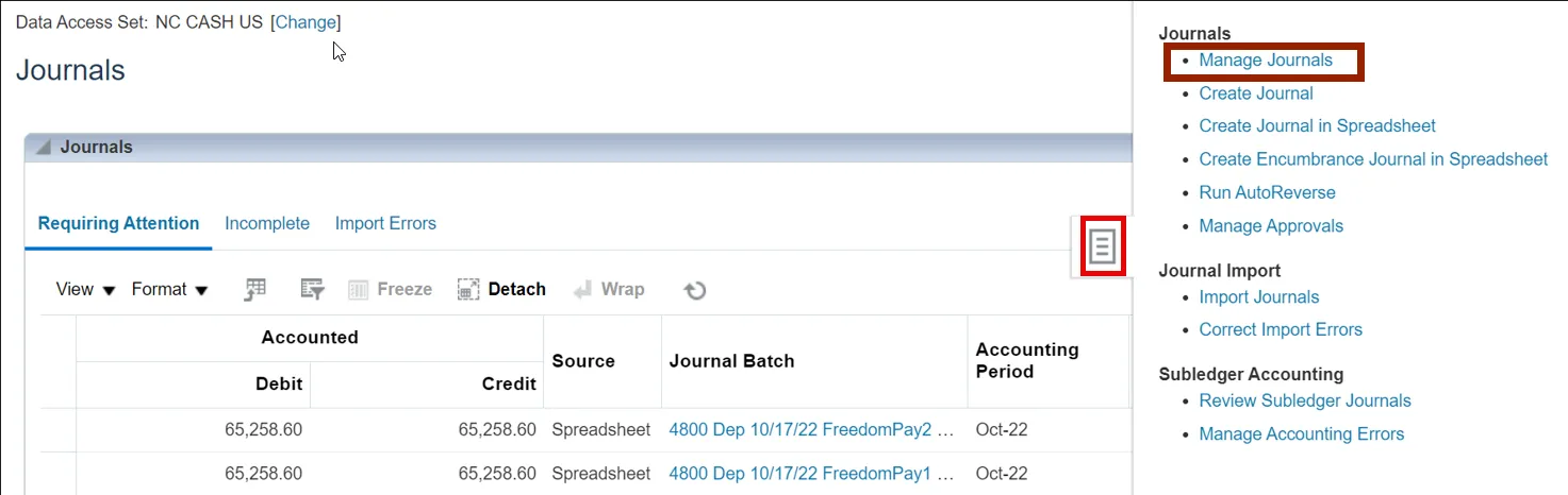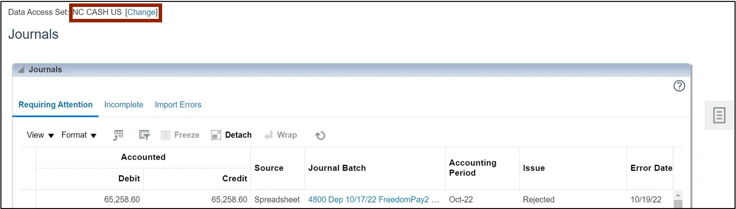 Step 3. On the Journals page, select the appropriate Data Access Set on the top left corner by clicking Change.