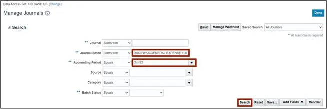 Step 5. On the Manage Journals page, for the fields of **Journals, **Journal Batch, **Accounting Period, and **Batch Status, enter at least one field and click the Search button.