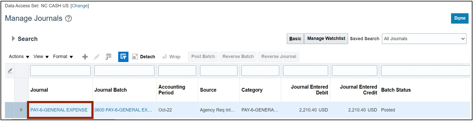 Note: If several journals appear under the Search section, determine the relevant Accounting Period, and select the Journal associated with that.