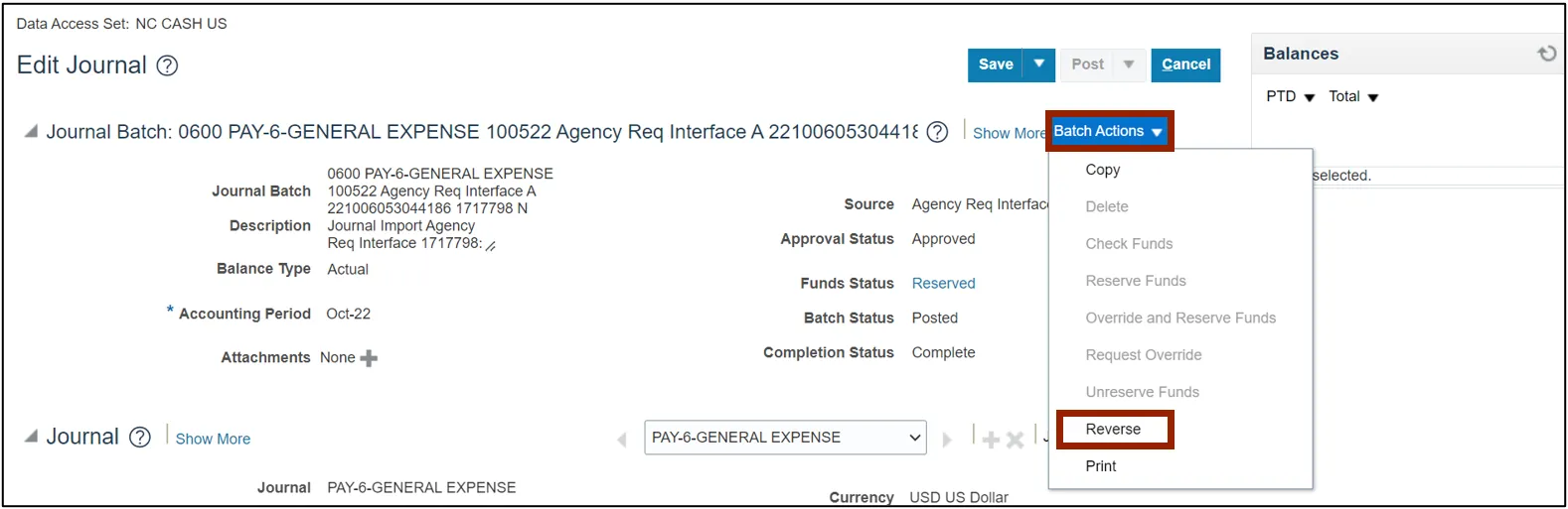 Step 7. Under the Journal Batch section, click the Batch Actions drop-down choice list and select Reverse.