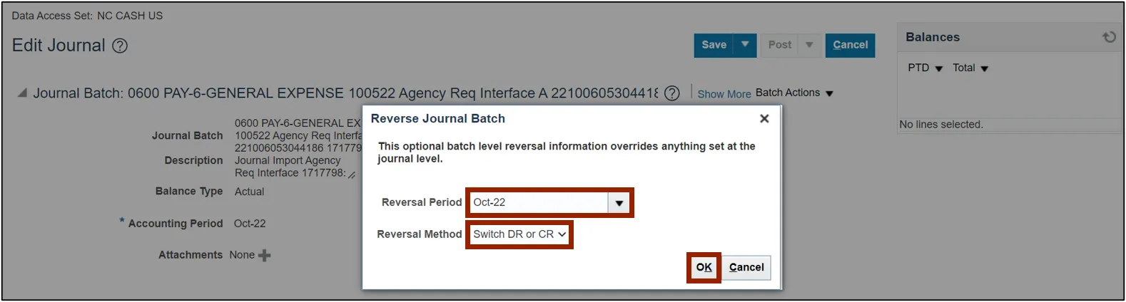 Step 8. On the Reverse Journal Batch pop-up, select the applicable Reversal Period and Reversal Method from the respective drop-down choice lists.