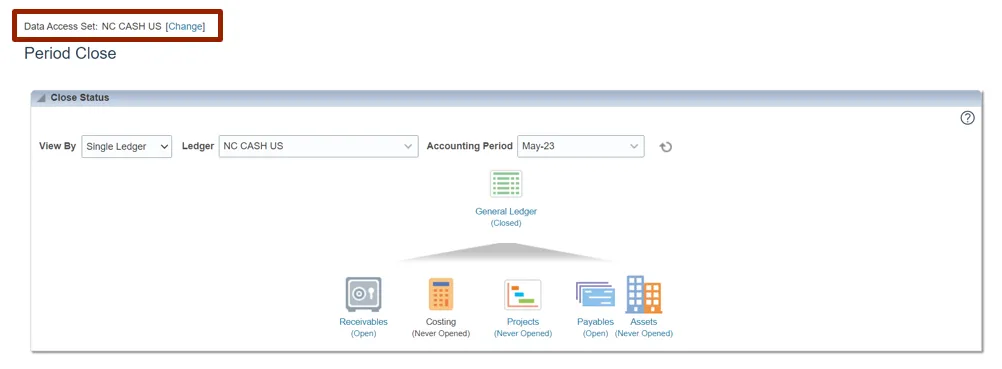 Step 4.    On the Period Close Dashboard, click the Change button next to Data Access Set to change access set. In this example, choose NC CASH US.