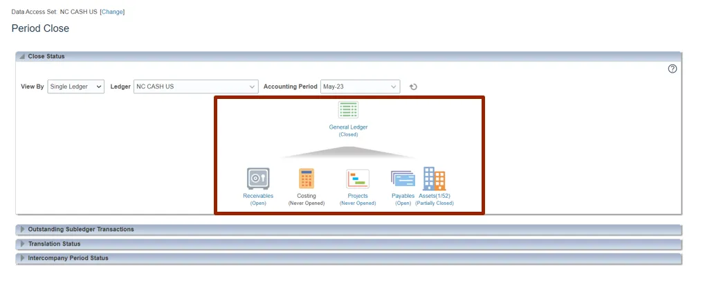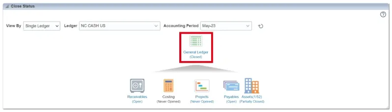 Step 7.    In the Close Status section, click on the respective icons to view the period status for each subledger.