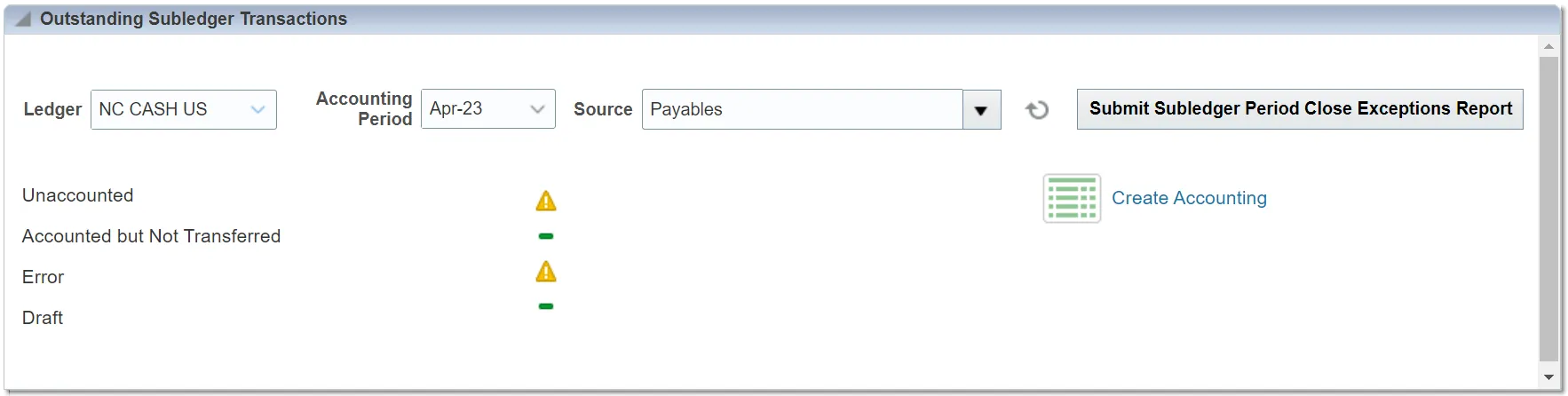 1)    Outstanding Subledger Transactions - This will notify you of anything that has errors or is in draft mode, as well as anything that has been accounted for but not transferred to the ledger. Additionally, you may drill further into the transactions listed here to perform any necessary reconciliation or investigation.