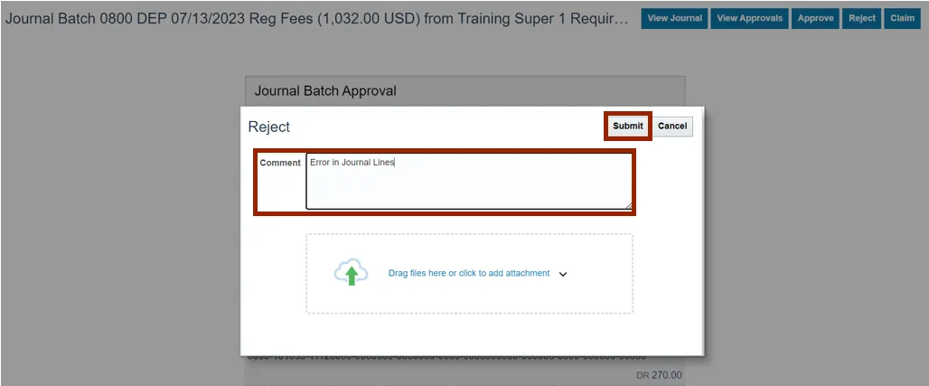 Step 12.    The Reject pop-up appears. Enter Comment in Comment field and Click the Submit button. The Invoice is rejected.