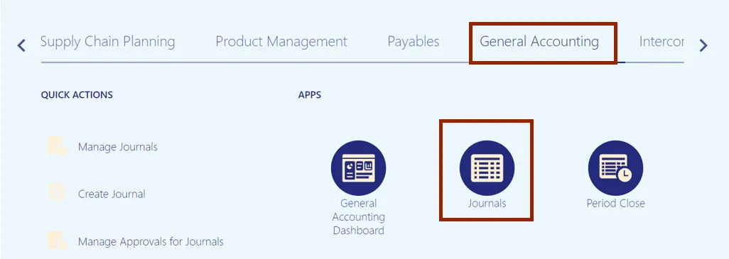 Step 2.    On the Home page, click the General Accounting tab and click the Journals app.