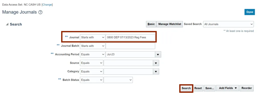 Step 4.    The Manage Journals page opens. Enter your search criteria, such as the Journal name, and click the Search button.