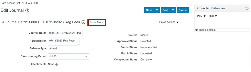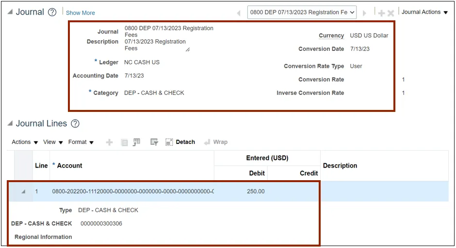 Step 7.    Scroll down and validate the Journal details (For e.g., Ledger, Category and Journal Lines (for e.g., Account segment values, and DFF bank account field for deposits).