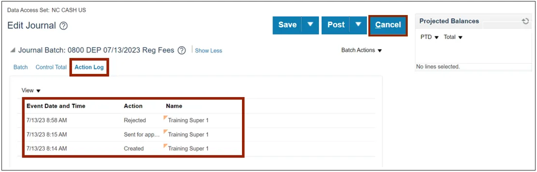 Step 8.    Click the Action Log tab and review the details. Click the Cancel button. You are redirected to the Manage Journals page.