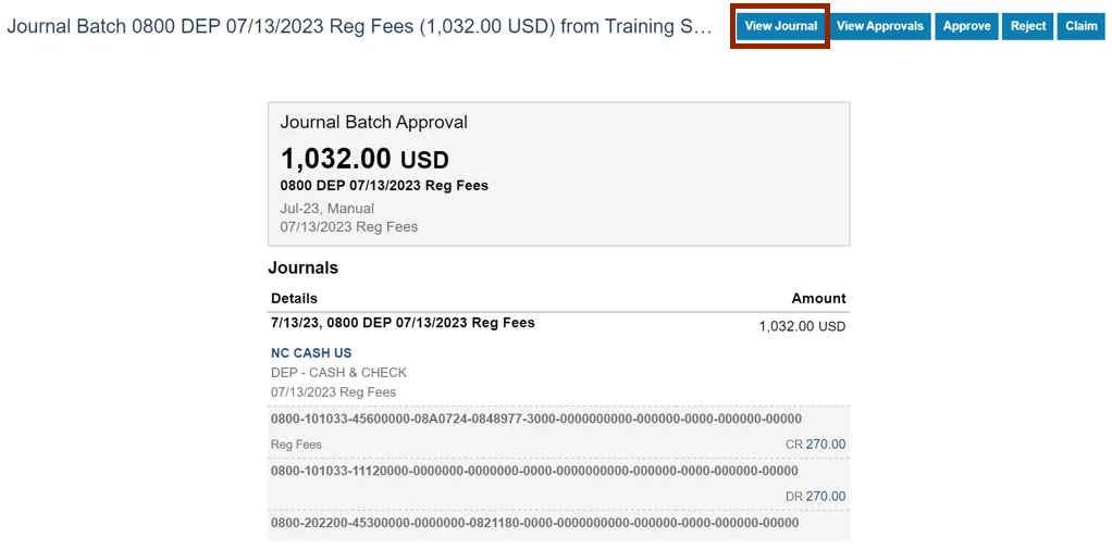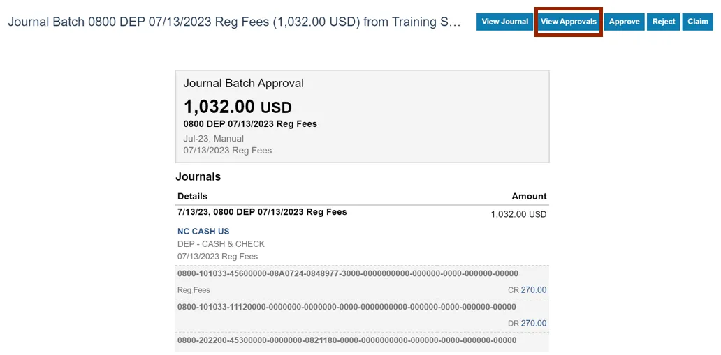 Step 9.    On the Journal Batch page, click the View Approvals button.