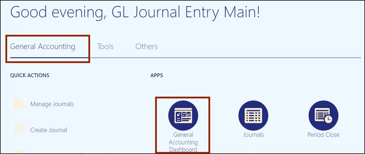 Step 2.    On the Home page, click the General Accounting tab and select the General Accounting Dashboard app.