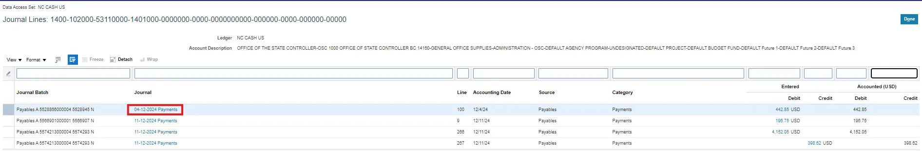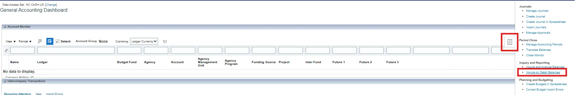 User Tip: Users entering this screen for the first time, might have to select Data Access Set (top left corner) if it does not default to NC Cash US.