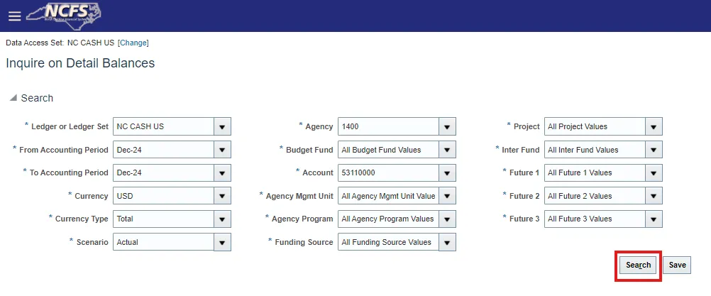 Step 8.    To save search parameters that are frequently used, from the Inquire on Detail Balances screen select Save.