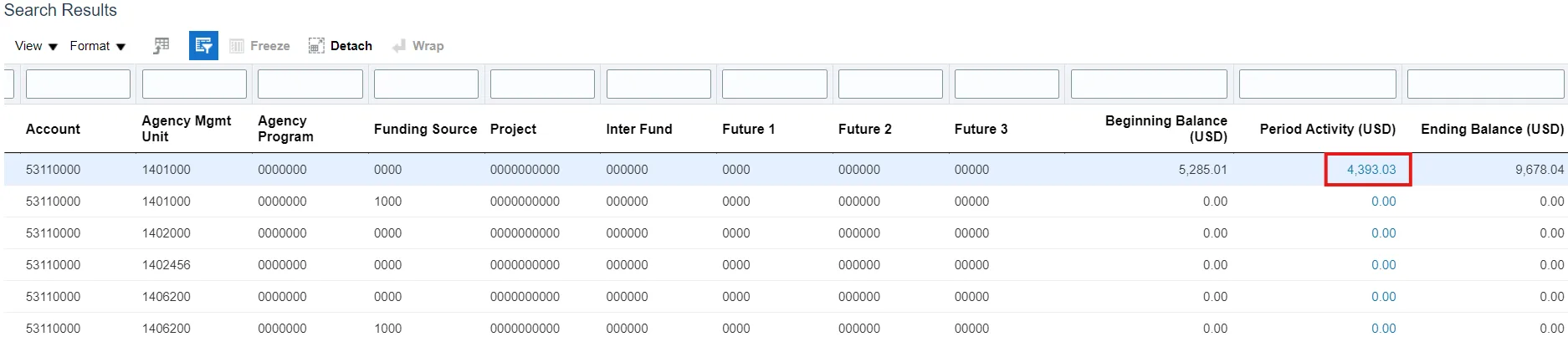 Step 5.    Under your search results, click on the Period Activity (USD) Hyperlink to view additional transaction details.