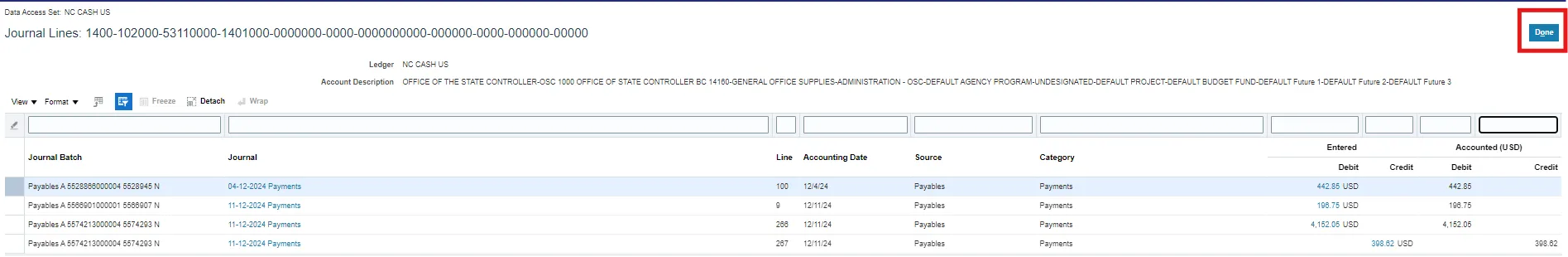 Step 7.    Click Done to return to Inquiry on Detail Balances Screen.