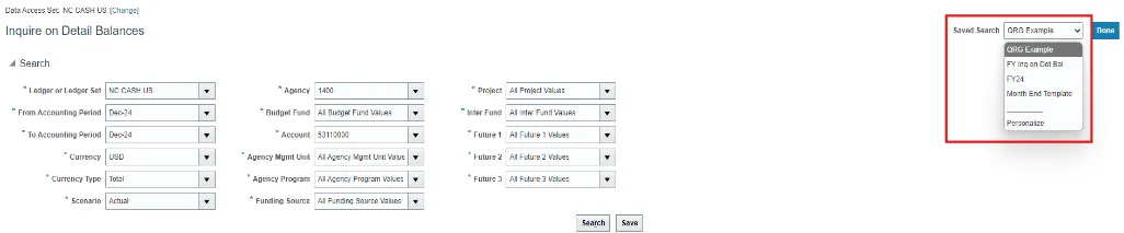 Note: You can save frequently used searches by clicking save, name the search, and click ok. You will find your saved search parameter under saved searches on your Inquire on Detail Balances screen.