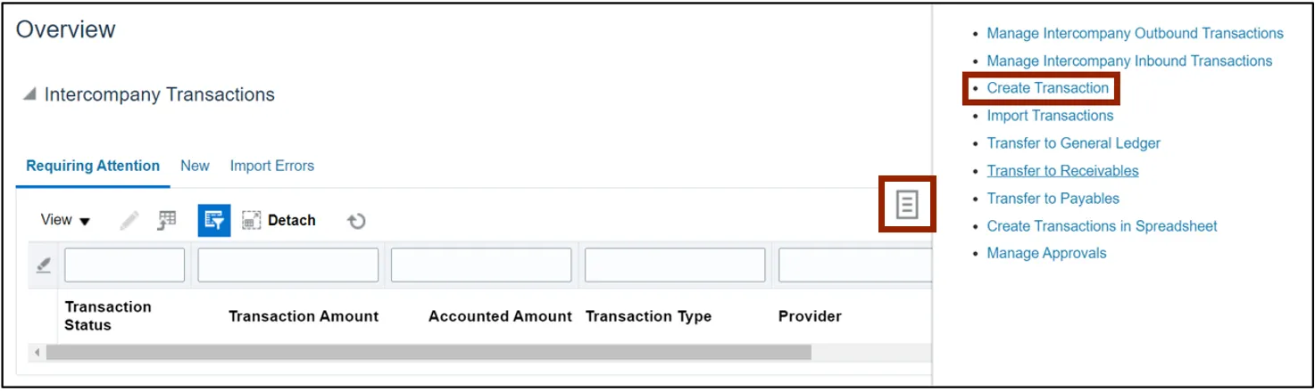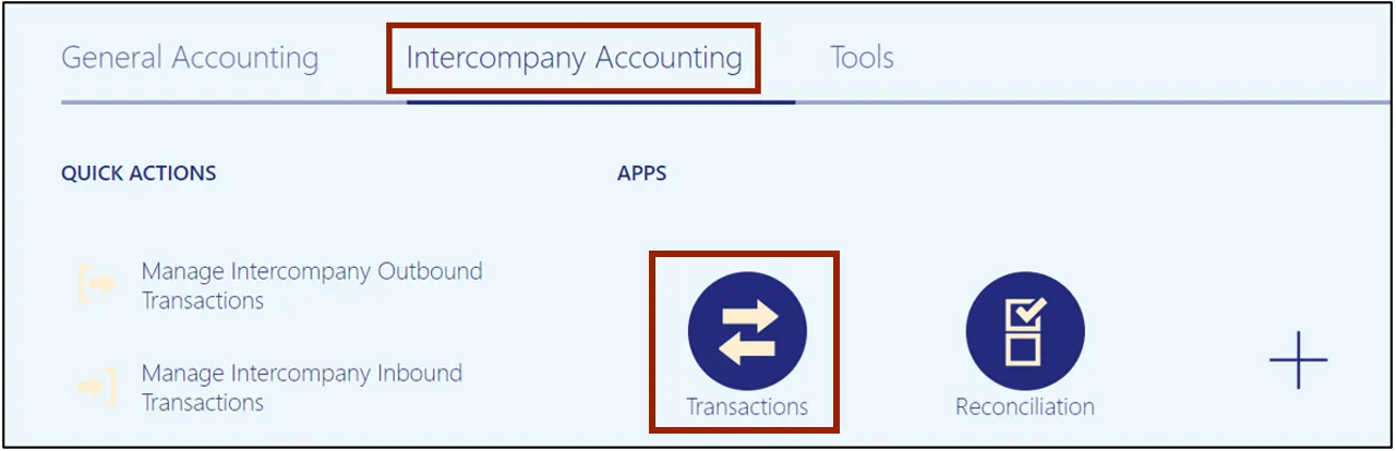 Step 2. On the Home page, click the Intercompany Accounting tab and select the Transactions app.