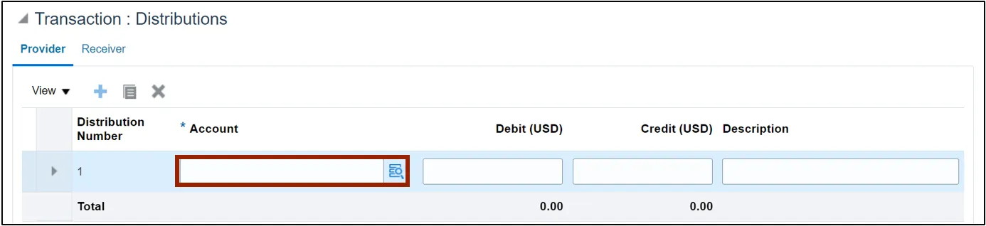 Step 12. Enter the distribution account details within the Account field. Click the Account icon to select individual account segment values from the Account pop-up.