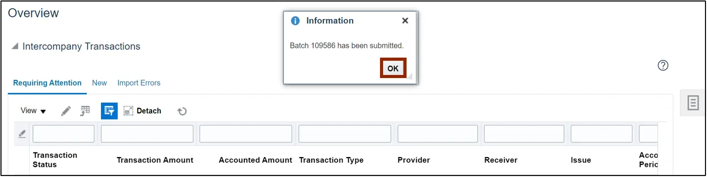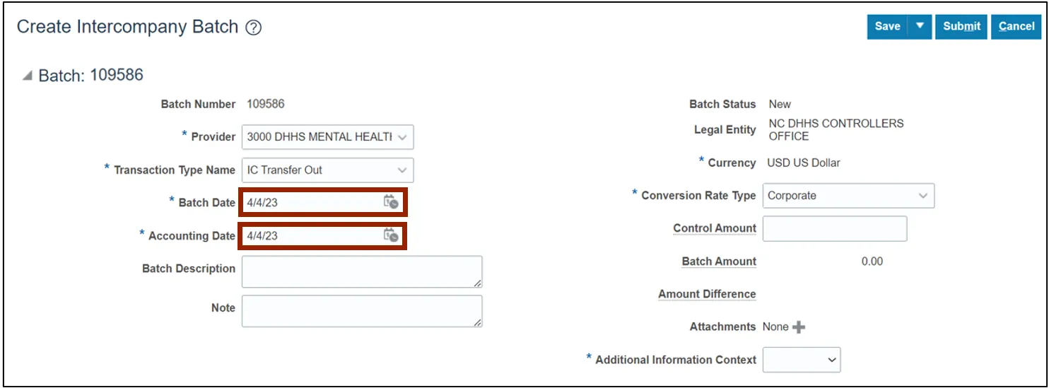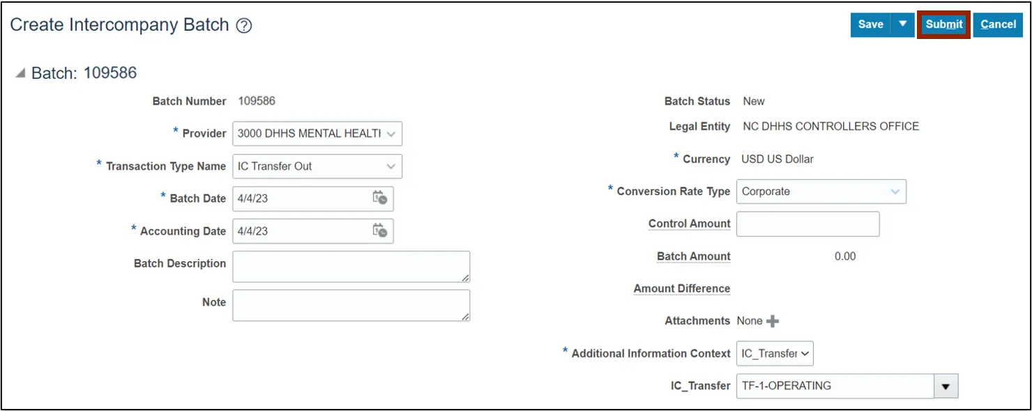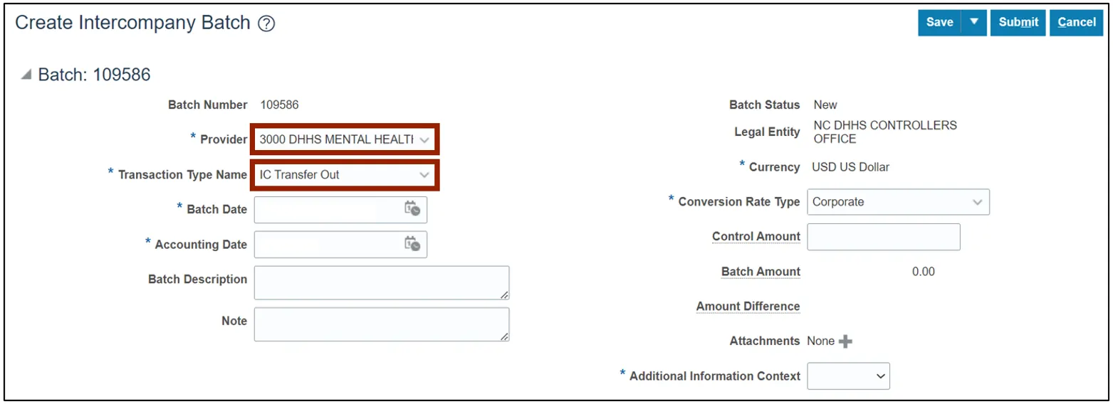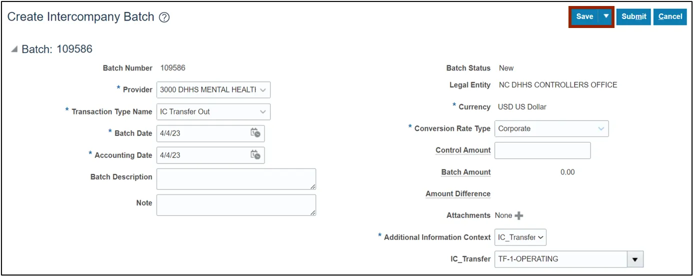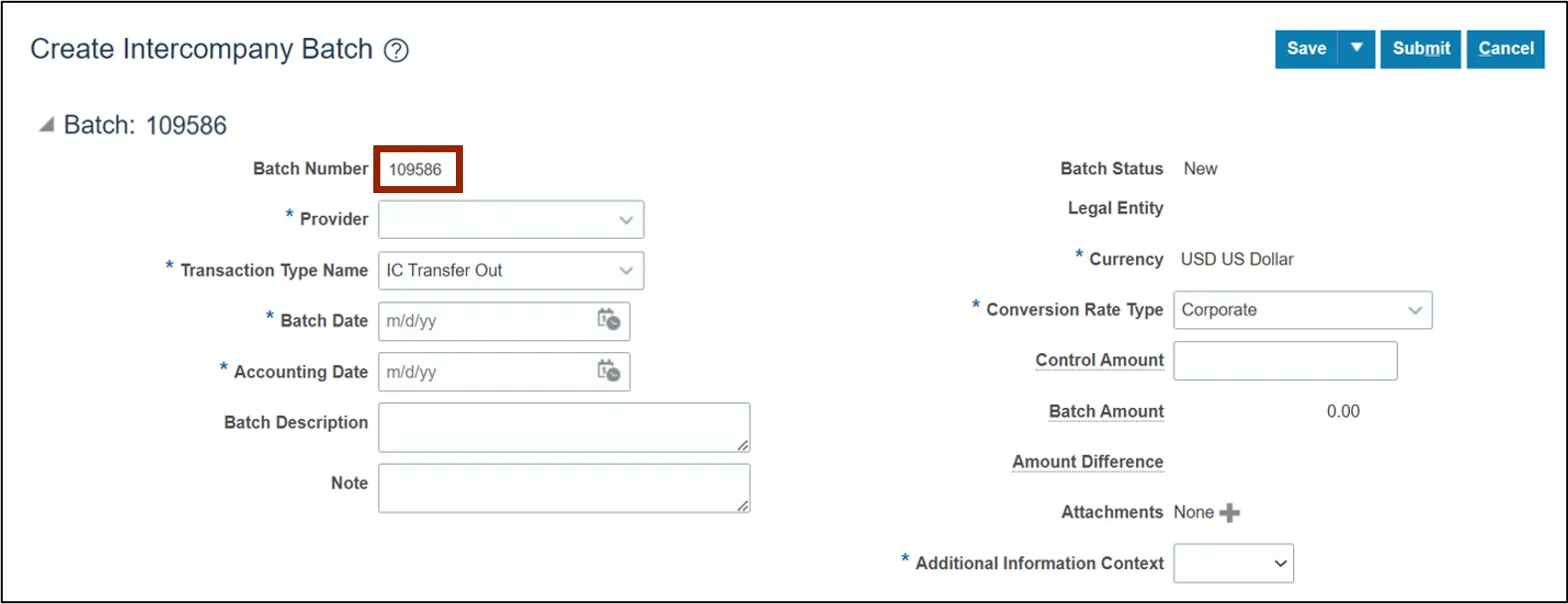 Step 4. On the Create Intercompany Batch page, the Batch Number is pre-populated.