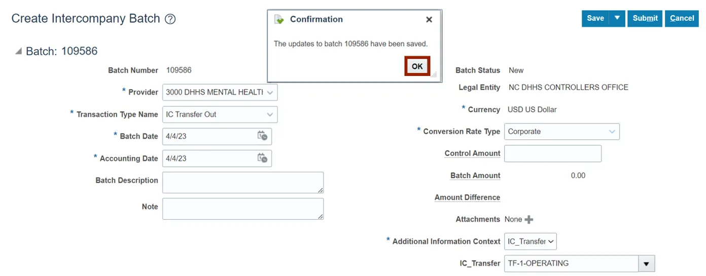 Note: This Batch Number will assist with searching for the transfer in the future.