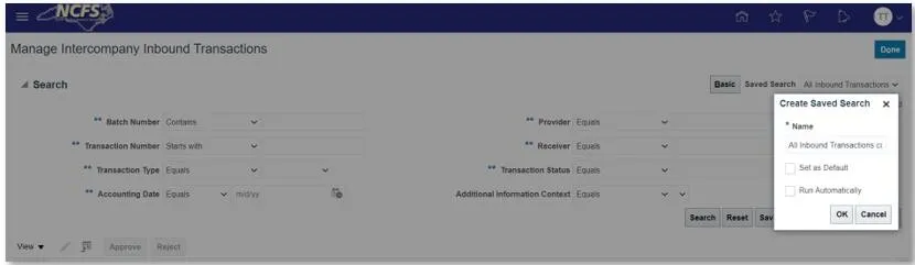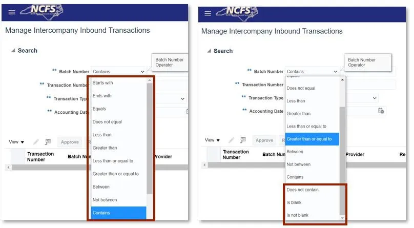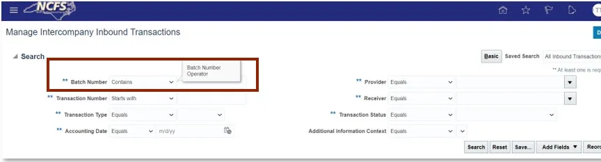 The NCFS Search capabilities are designed to make it easier to locate needed information. These capabilities assist users in retrieving and analyzing a large number of intercompany transactions to locate the desired transaction. The conditional operators and saved search functionalities allow for further refinement and efficiencies to accomplish this task.