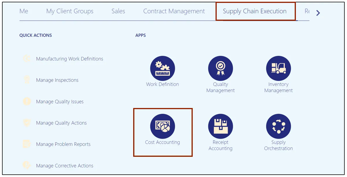 Step 2. On the Home page, under the Supply Chain Execution tab, click the Cost Accounting app.