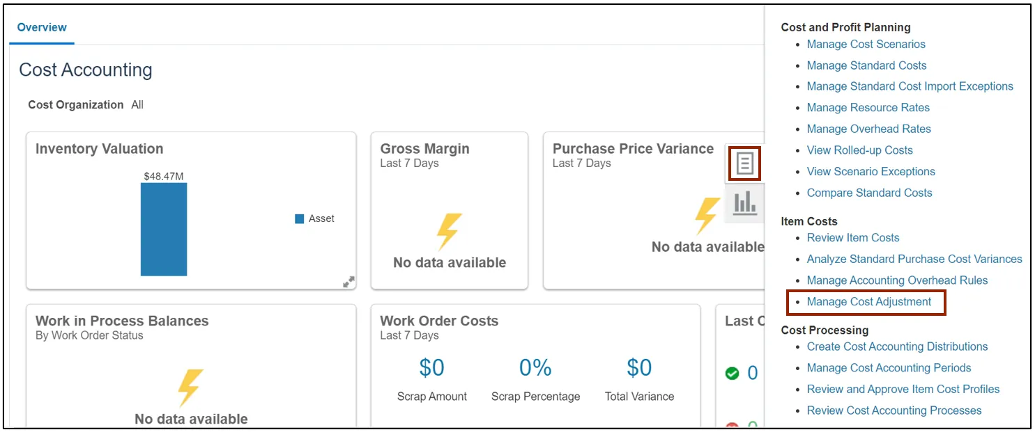 Step 3. Click the Tasks icon. In the Item Costs section, click Manage Cost Adjustment.