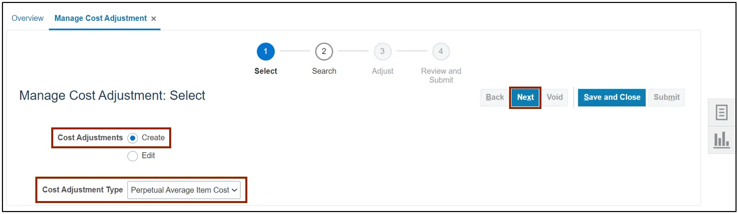 Step 4. In the Cost Adjustments field, click the Create radio button. From the Cost Adjustment Type drop-down choice list, select Perpetual Average Item Cost. Click the Next button.
