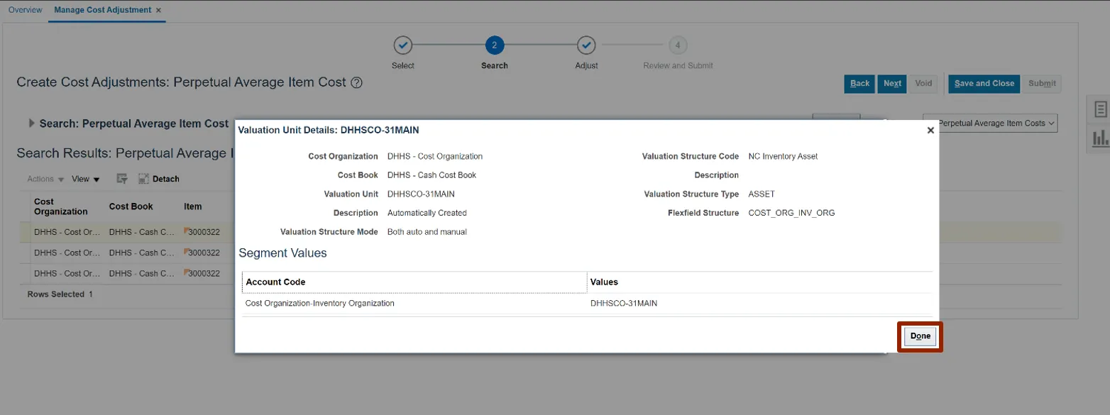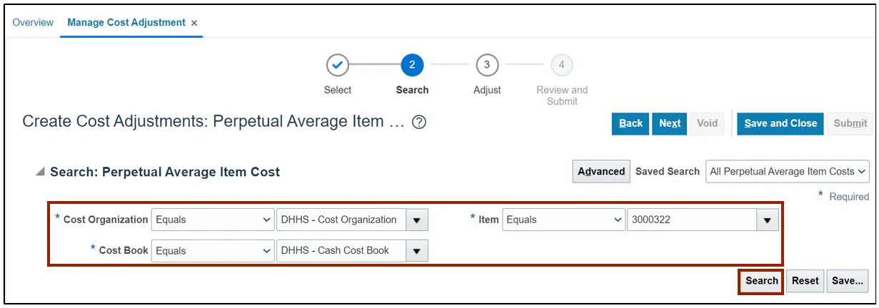 Step 5. In the Search: Perpetual Average Item Cost section, enter the Cost Organization, Cost Book, and Item details. Click the Search button.