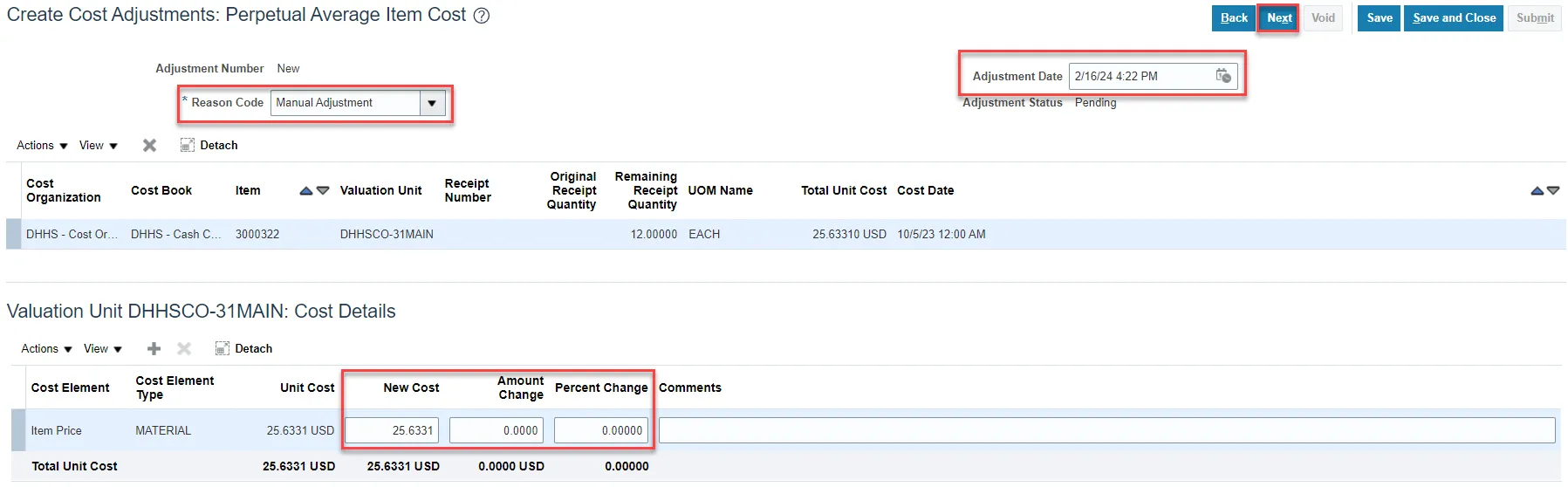 Step 9. Select Manual Adjustment from the Reason Code drop-down choice list. Select the Adjustment Date as the current date of the Cost Adjustment. Enter the new cost, amount change or percent change details in Valuation Unit: Cost Details field. Click the Next button.
