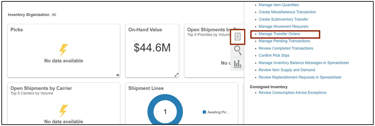 Step 12.    Click the Tasks icon. Under the Inventory section, click Manage Transfer Orders.