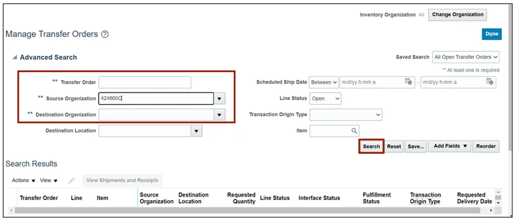 Step 13.    In the Advanced Search section, enter all mandatory details and click the Search button.