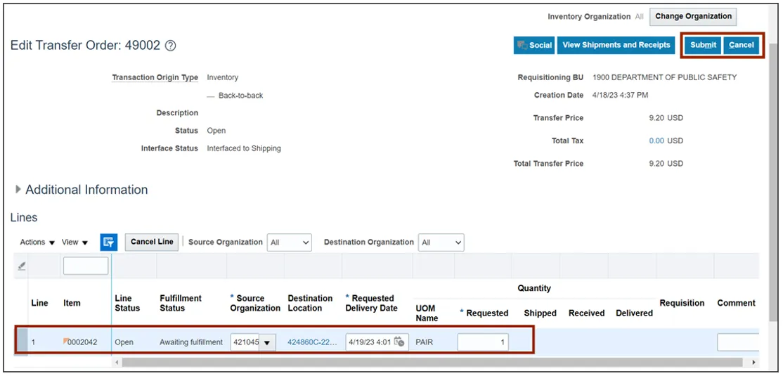 Step 15.    On the Edit Transfer Order page, validate that the details are correct. Certain edits to the order can be made here.