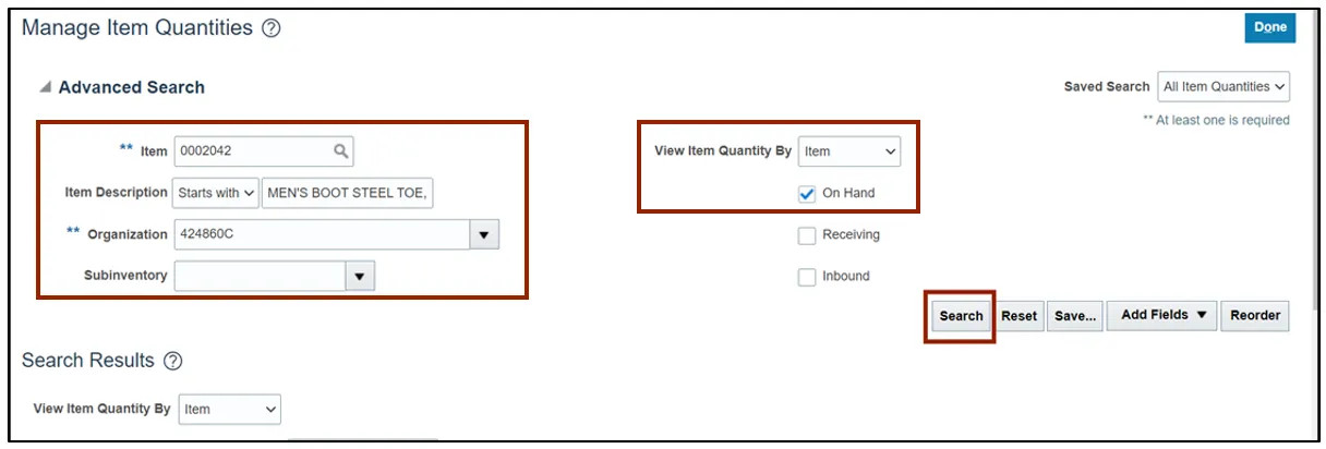 Step 5.    In the Advanced Search section, enter the mandatory details and select the On hand option for View the Item Quantity By field. Click the Search button.