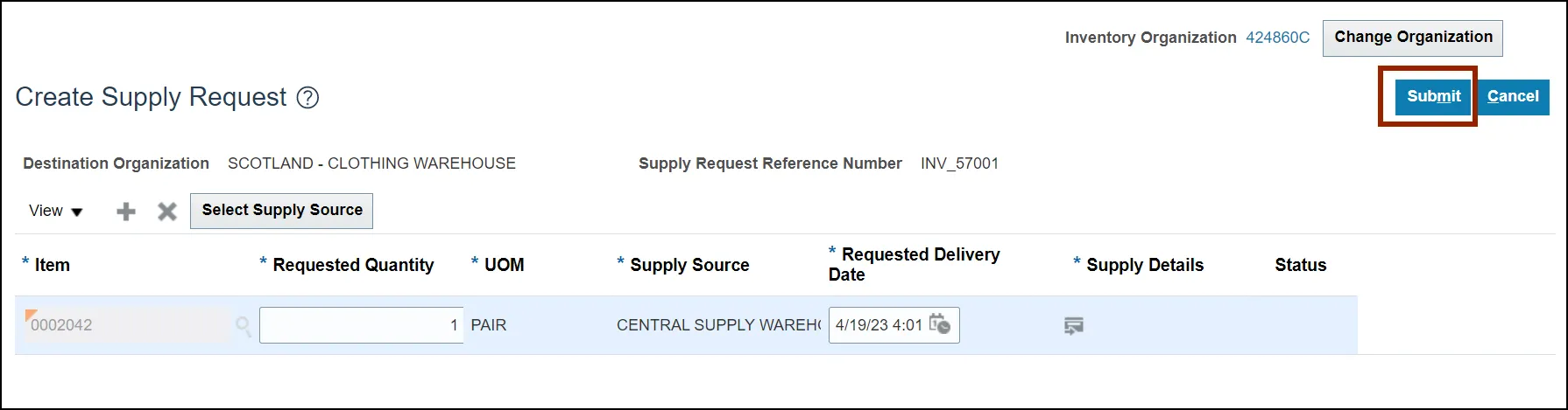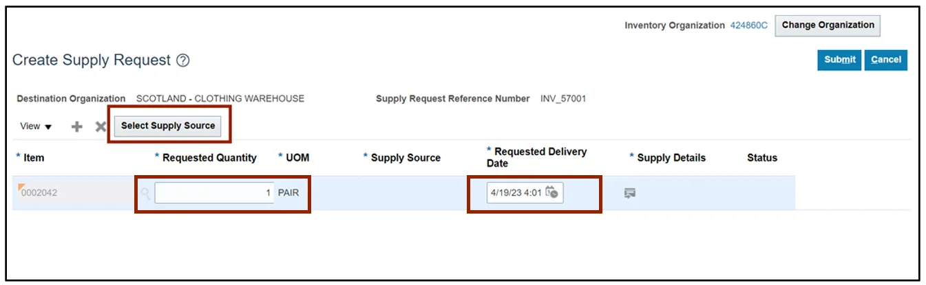 Step 7.    Enter Requested Quantity and Requested Delivery Date. Click the Select Supply Source button.