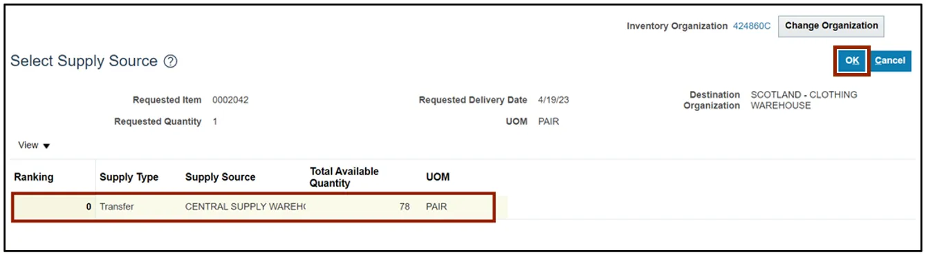Step 8.    Select a record from the list of supply sources and click the OK button.
