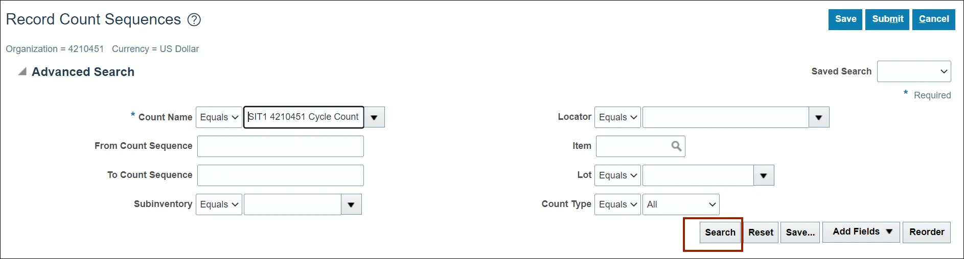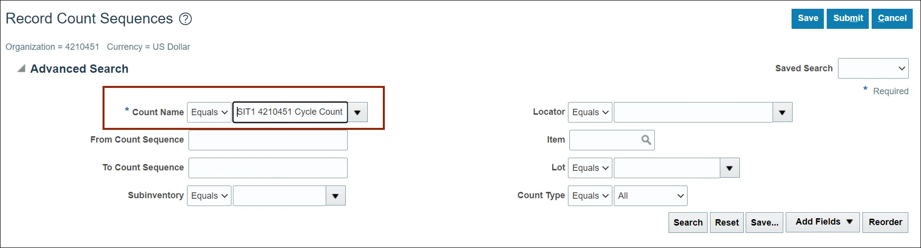 Step 10. On the Record Count Sequences page, enter the Count Name in the Advance Search criteria section.