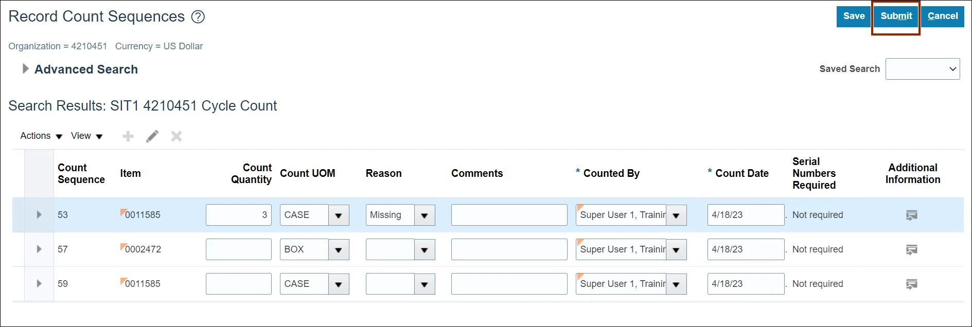 Once submitted, the Cycle Count Approver will be notified to approve, reject, or request a recount of this cycle count.