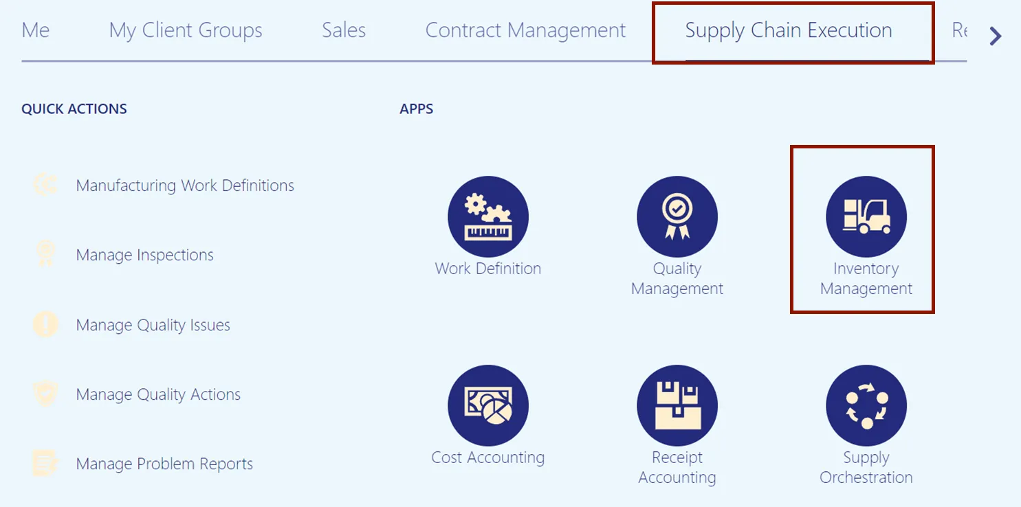 Step 2. On the Home page, click the Supply Chain Execution tab and then click the Inventory Management app.