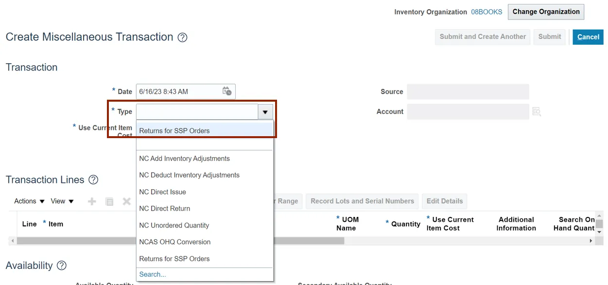 Step 2. Navigate to the Create Miscellaneous Transaction page. Click the Type field, then select the appropriate Type – Returns for SSP Orders, NC Add Inventory Adjustments, NC Direct Return, NC Unordered Quantity.