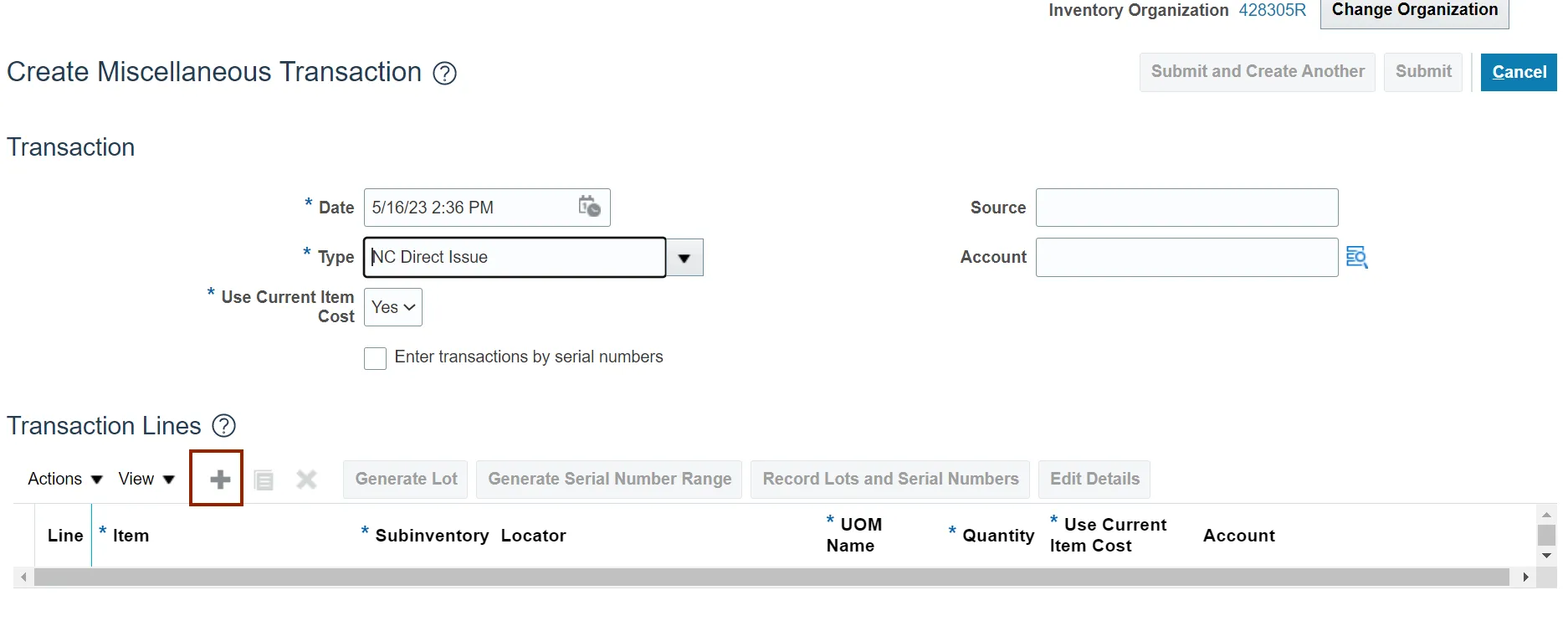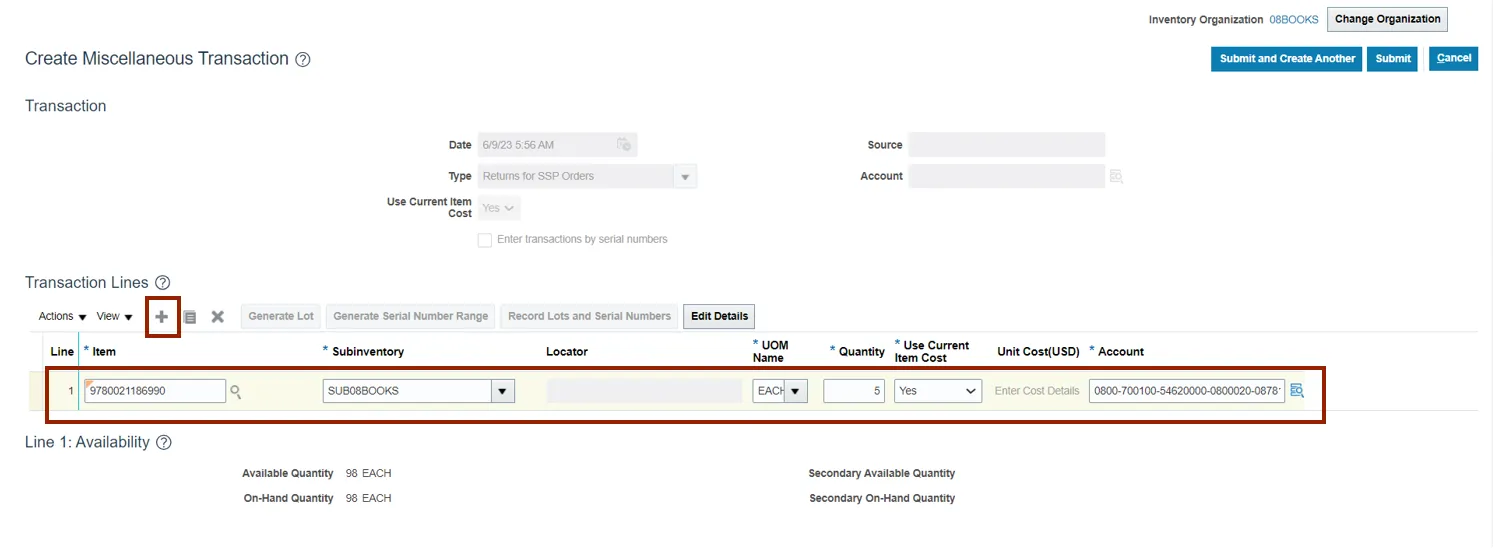 Step 3. Click the Add icon, and under the Transaction Lines section, enter the Item details and any other information per requirement.