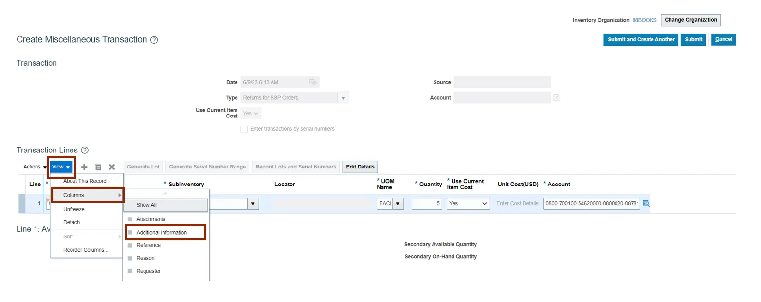 Step 4. Under the Transaction Lines section, click on View > Columns > Additional Information.