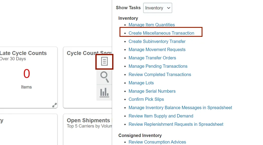 Step 5. Click the Tasks icon, and click Create Miscellaneous Transaction.
