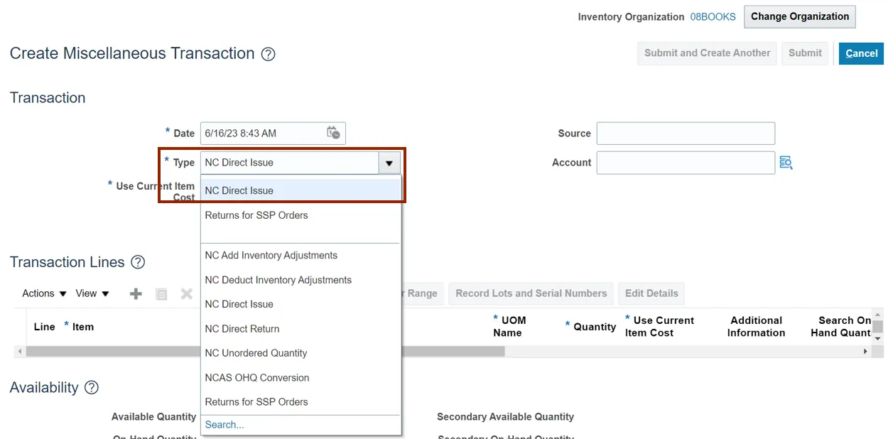 Step 6. On the Transaction section, click the Type drop-down, then select the appropriate type – NC Direct Issue or NC Deduct Inventory Adjustments.