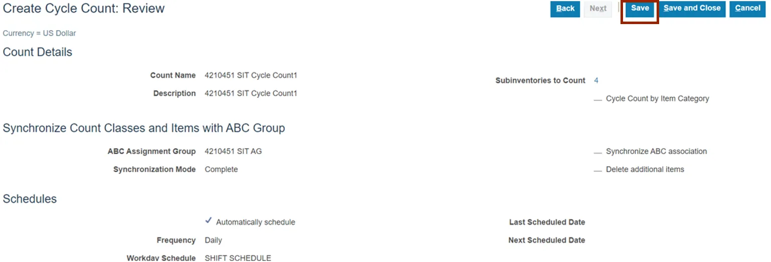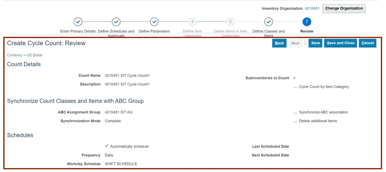 Step 14. Review the details of the cycle count created. Additional details can be viewed by scrolling down.