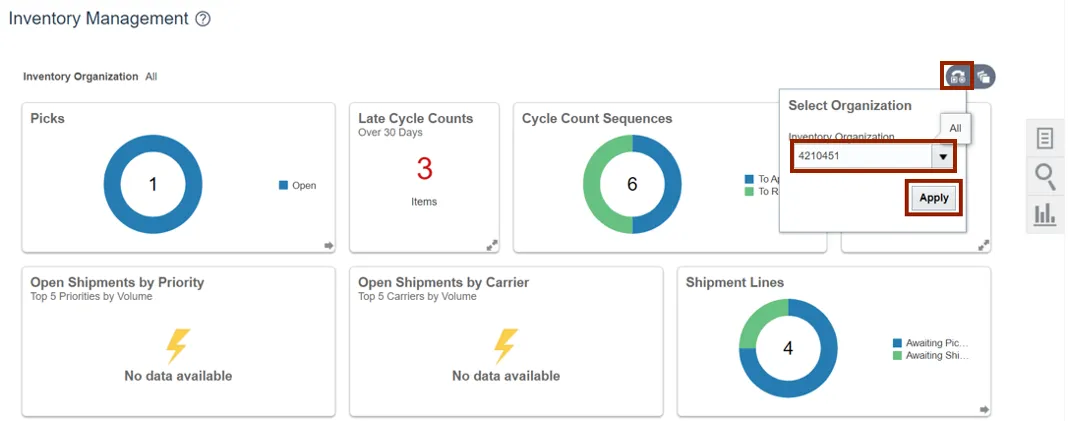 Step 3. On the Inventory Management dashboard, click the View By icon. Click the Inventory Organization drop-down choice list, select the Inventory Organization.